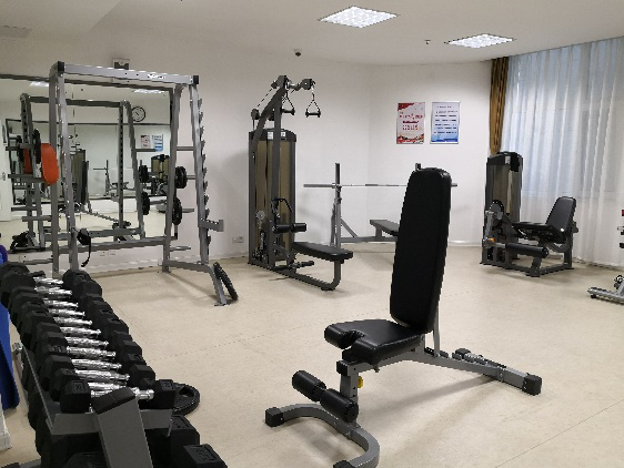 Professional classroom for physical rehabilitation training of limbs and organs through physical facilities. The classroom is equipped with tension trainers for chest and back, dual-track paddle training, ladder training, training racks, electrically-operated vertical lift bed, pullers, hydraulic step trainers, stopwatches, and pedometer for ten thousand steps and other auxiliary facilities to complete effective rehabilitation training.